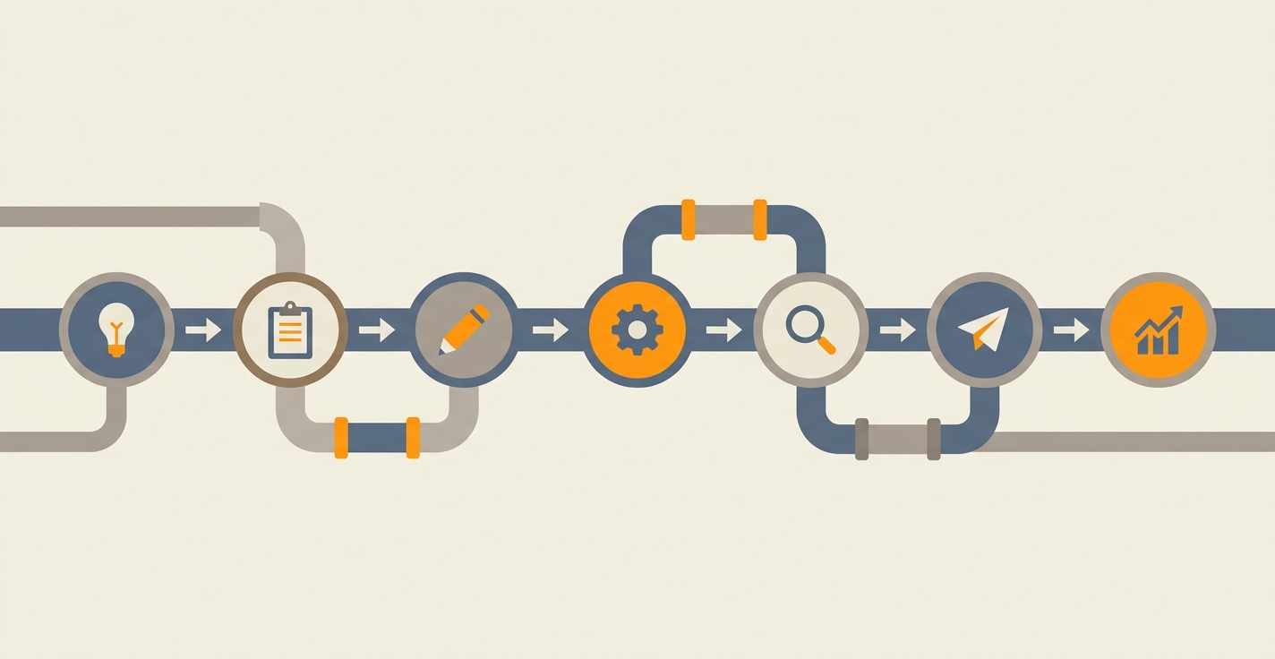This guide walks through every stage with the inputs, outputs, and common failures. Use it as a template for your own process or to audit why your current pipeline stalls. Every stage here assumes you are publishing for SEO, not one-off campaigns.