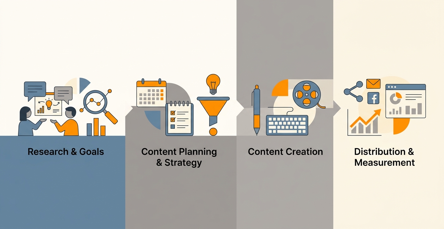 Month 1: Build foundation. Define your audience personas, map the buyer journey, run keyword research for 20-30 target queries. Publish 4 pillar articles (one per buyer stage, one product category). These don't need to be long. A solid 1,500-word buying guide is enough to start.